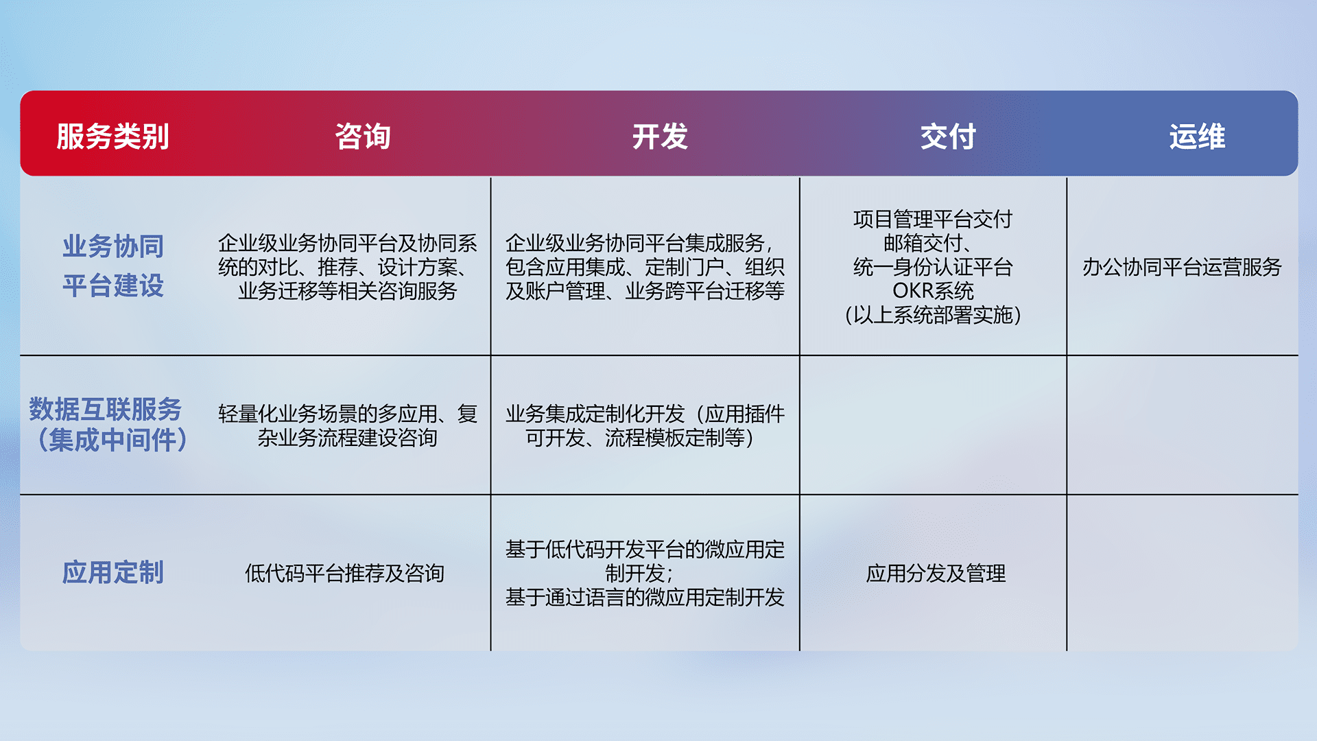 针对钉钉、、企微、、、、IDaas等平台级产品提供产品的规划、、方案、、、、交付、、、定制化开发等服务,,实现如统一协同办公、、、智能客户服务、、混合会议管理、、、智能数据查询、、、等业务场景,,,实现数字化转型。。。。