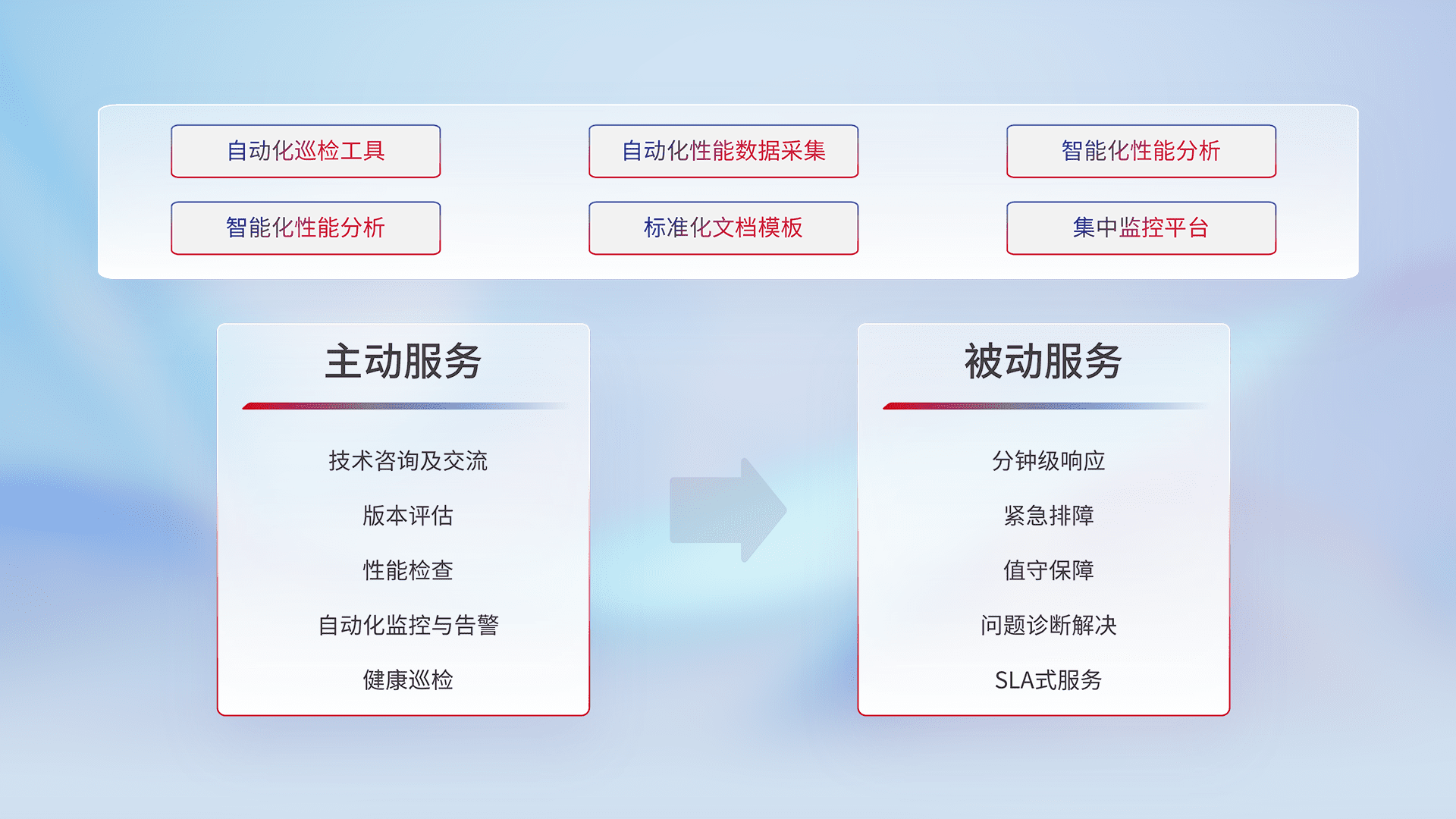 智能化工具和标准化文档,,,,保障服务质量,,,,提供主动服务(包含技术咨询、、版本评估、、性能检查、、自动化监控与告警、、健康巡检)和被动服务包含(分钟级响应、、紧急排障、、值守保障、、、、问题诊断解决、、SLA服务)。。。