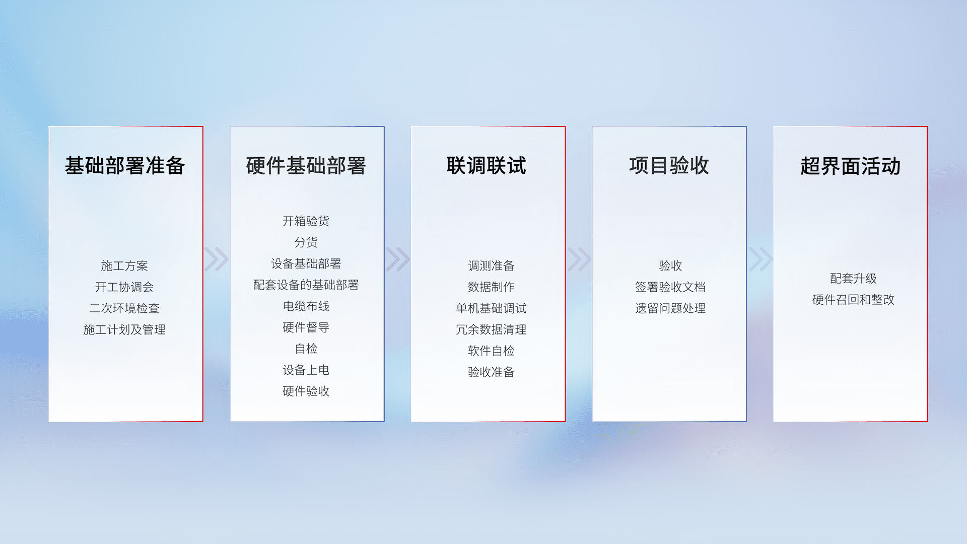 从基础部署准备、、、硬件基础部署、、、、联调联试、、、、项目验收、、、、越界面活动的全过程可追溯,,,,保证施工质量和进度。。